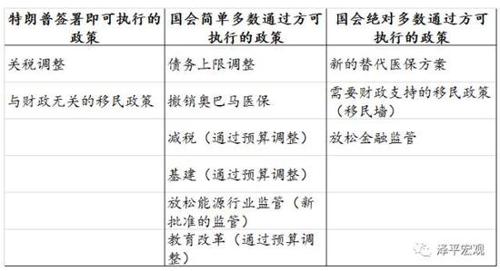 在特朗普的政策框架中,特朗普上任后在无需国会授权就可以着手进行的是对非法移民的处置和贸易政策。在简单多数通过的情况下,特朗普可能先废除奥巴马全民医保方案,通过预算调整方式降低企业税促投资和重建基础设施以及放松能源行业监管。调整债务上限也是特朗普在任内实施扩张性财政政策不可避免的议题。由于修建移民墙、出台新的医保方案以及放松金融监管需要国会的绝对多数通过,因此,这些政策的落实大概率要落在2018年之后。