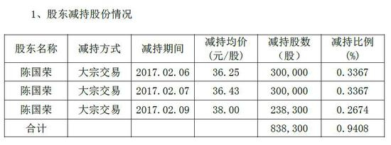 减持计划发布刚满一个月,高科石化持股5.94%的董事陈国荣就落实了减持行动,在2月6日-9日通过大宗交易累计减持了83.83万股,占公司总股本的0.94%。减持完成后,陈国荣的持股比例下降至了5%。