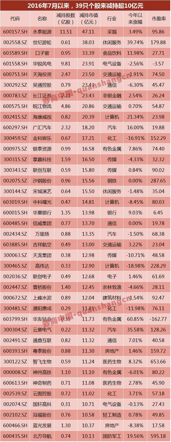 虽经历熔断行情,2016年依然减持了1103.89亿元。2016年下半年以来,两市共计减持了39.12亿股,市值达713.01亿元,其中有39只个股涉及的减持市值超过10亿元。截至目前,永泰能源、世纪游轮和口子窖位居减持排行榜前三名,减持市值分别达到47.11亿元、38.03亿元和33.39亿元。