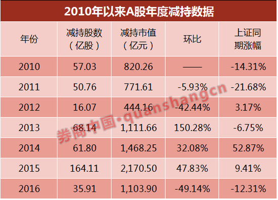 据券商中国记者统计,2010年以来A股重要股东保持连续7年净减持,其中最低减持年份出现在2012年,全年只减持了444.16亿元,减持高峰出现在2015年的快牛行情下,这一年减持市值达2170.5亿元。