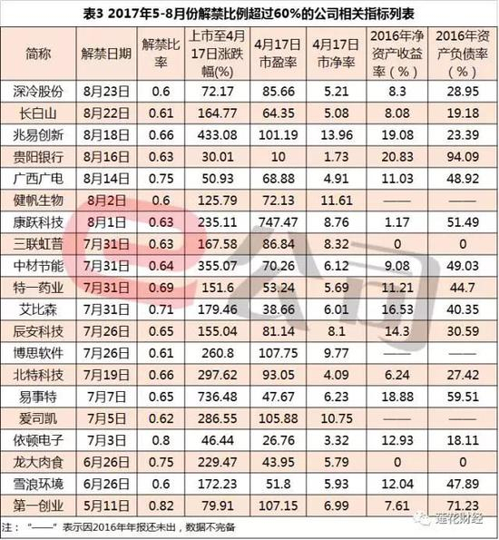 1、在次新股解禁前后20天,要规避解禁比例高于60%的上市公司(2017年5月至8月解禁比例较高的上市公司如表3所示)。