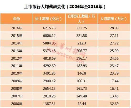 随着上市银行的增多,从业人员的数量也从2006年的42.44万人,增加至2016年底的221.75万人,增幅为523%。
