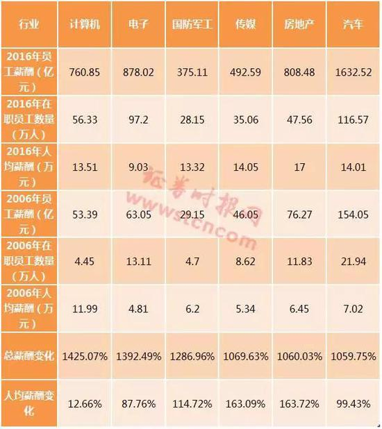 从员工薪酬角度上看,与2006年相比,2016年房地产、传媒、国防军工等板块人均薪酬增幅均翻倍,计算机、电子和汽车人均薪酬增幅不足100%。