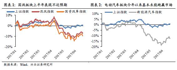 市场预期底部,有望出现修复行情。上半年市场对国企改革和电动汽车主题预期较低,两个板块表现较为一般。一方面,金融去杠杆环境下,监管趋严导致市场风险偏好持续下降,资金对于消费白马的“抱团”使国改等主题缺乏表现机会;另一方面,主题本身也缺乏较强催化剂。以电动汽车为例,由于电动汽车补贴目录出台的推迟,地方预算未能及时出台,导致上半年电动汽车产销数据均较为疲弱,市场关注度较低。