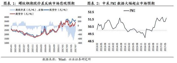 一方面,市场悲观预期的修复是本轮周期反弹重要因素之一。二季度螺纹钢期货深度贴水反映了市场对周期品极度悲观的预期。随着6月PMI数据超出市场预期(6月PMI为51.7,超出5月0.5个百分点),市场对前期深度悲观的预期有所恢复,螺纹钢期货价格出现一定修复。动力煤价格受山西环保督查和内蒙古煤票限制升级事件性推动有所反弹。