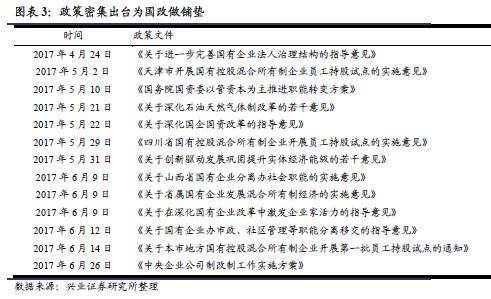 6月以来,不管是决策层的表态,还是央企或地方的改革推进都出现积极的变化:1)中央层面:国资委6月2日表示将加快深度调整央企重组步伐;发改委6月15日表示将加速央企职业经理人薪酬制度改革;6月26日深改组制定公司制改革时间表;2)央企层面:6月4日神华与国电电力停牌重组;6月19日东航物流“大尺度”混改方案落地,集团放弃绝对控股权,员工持股比例高达10%;3)地方层面:山西5月15日出台《关于深化国企国资改革的指导意见》;天津6月6日推出200余个混改项目,10大集团拟引资1100多亿进行混改;6月7日白药混改再进一步,江苏鱼跃拟以56.38亿元入股白药。我们认为十九大前后是国企改革的重要窗口,近期国改也开始传递积极信号,下半年国企改革的加速推进,四条线把握国改机会:
