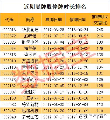 7月17日:东诚药业、全新好、紫光国芯、数字政通、欣泰退复牌,当天股价跌停;