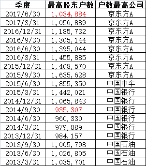 最高股东户数,是指上市公司中股东户数最高的公司的股东户数数量,今年6月底最高股东户数的公司还是京东方A,持股股东户数为103.49万户。