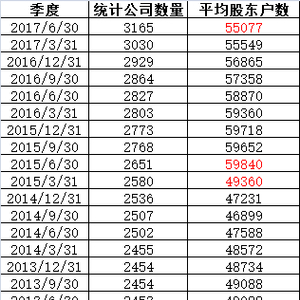 由于新股上市总是连续涨停,新股在目前市场环境中仍然具有一定溢价与炒作效应,因而统计股东户数的时候,剔除最新季度上市的股票,即统计2017年6月底上市公司股东户数,只统计到2017年3月底上市之前的公司,同理类推。