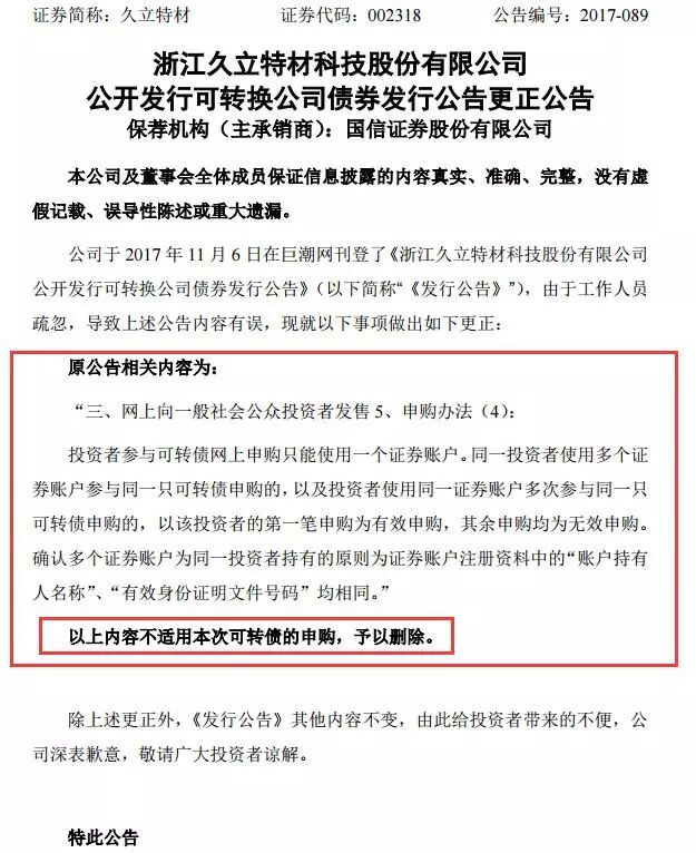 这不,久立特材今日晚间就发布了更正公告,将适用于上交所的转债申购规则予以删除: