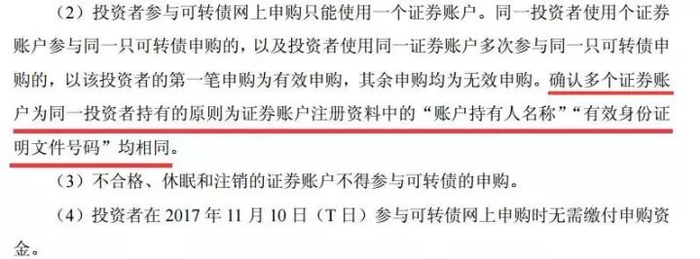 投资者参与可转债网上申购只能使用一个证券账户。同一投资者使用个证券账户参与同一只可转债申购的,以及投资者使用同一证券账户多次参与同一只可转债申购的,以该投资者的第一笔申购为有效申购,其余申购均为无效申购。确认多个证券账户为同一投资者持有的原则为证券账户注册资料中的“账户持有人名称”“有效身份证明文件号码”均相同。