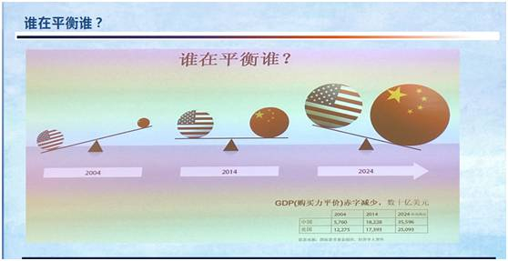 这个图是我两个月前在哈佛商学院我们一个教授做的,他的资料上说他曾经当过(类似于)美国国防部副部长。他讲中美两国的比较,我们可以看,这个图很简单。在2004年的时候美国是一个大球,2014年两国平衡,2024年,中国变成了大球,美国变成了小球。