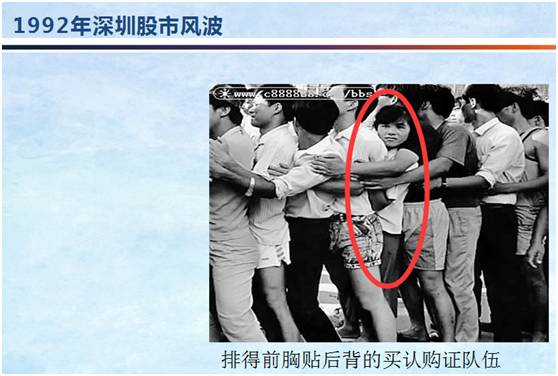 我是1992年到深圳的,股票风波刚刚结束,大家看到了这个女孩子吗?我觉得这个女孩子是中国突破中等收入陷阱成为发达国家的秘密,为什么?因为在座有很多女性,如果你走在街上一个男士突然从后面抱住你,你可能马上打一个巴掌然后报警,但这个女孩子为什么会这样?她抱着别人,别人也紧紧抱住她,为了赚钱。