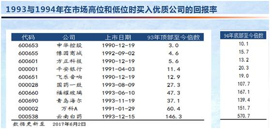 当然有一种办法是能穿越这种变化的。比方说,像我今年十一期间在伦敦,正好碰到了曹德旺先生,我们说如果选择好企业,在93年顶部你买入福耀玻璃的话大概是43倍的回报;如果很幸运买到底部的话,是167倍;如果更有洞察力的话,比方说买到云南白药的话,哪怕最高点是146倍,最低点是570倍。