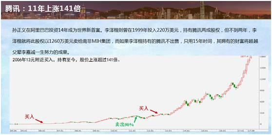 所以说我们投资比的是什么?比谁看的远,看的准,你一定要看的比马化腾还远,因为马化腾一路在卖股票。2008年他在卖,你要是跟马化腾经常喝酒、吃饭,你在买他股票,他在卖;前一段时间他又在卖,卖完又大涨。