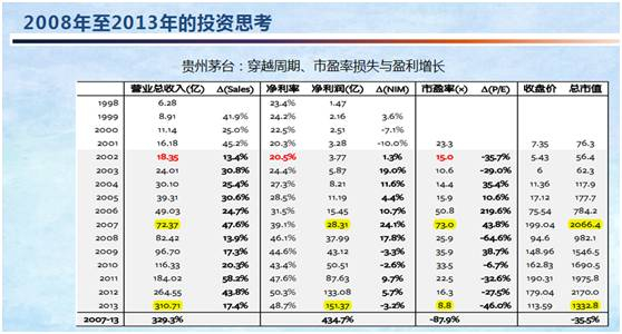 当时我们犯了一个什么错误?2007年的时候茅台的利润是28亿,到了2013年是150亿,利润增加4倍多;但是他的静态市盈率却从73倍跌到8.8倍,就是赚了这么多钱,还弥补不了他的市盈率损失。我们说这是茅台,换一个企业呢?你把它代进去就知道它面临多大的风险,隐含的收益是多少。所以说投资是非常难的事情。