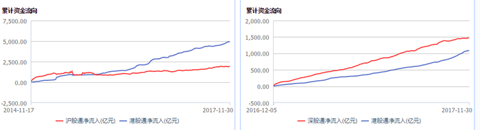 Wind数据显示,截至今年11月30日,沪股通和深股通累计成交4.32万亿人民币,为内地股票市场带来了3388亿人民币的净资金流入。北上资金在A股的持仓规模不断扩大。据港交所统计,三年来,沪股通在A股持股总额增长3.59倍,深股通更是环比增长12.4倍。