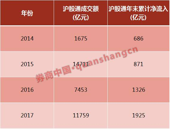 实际上,自沪港通开通以来,北上资金呈现持续净流入状态。2014年底开通,资金快速流入,一个多月时间净流入达到686亿。然而2015年,北上资金共成交1.47万亿,但净流入仅185亿。2016年,北上资金成交额大幅下滑,但该年净流入455亿。2017年,截至11月30日,沪股通成交再度活跃,重新步入万亿成交额,净流入599亿。