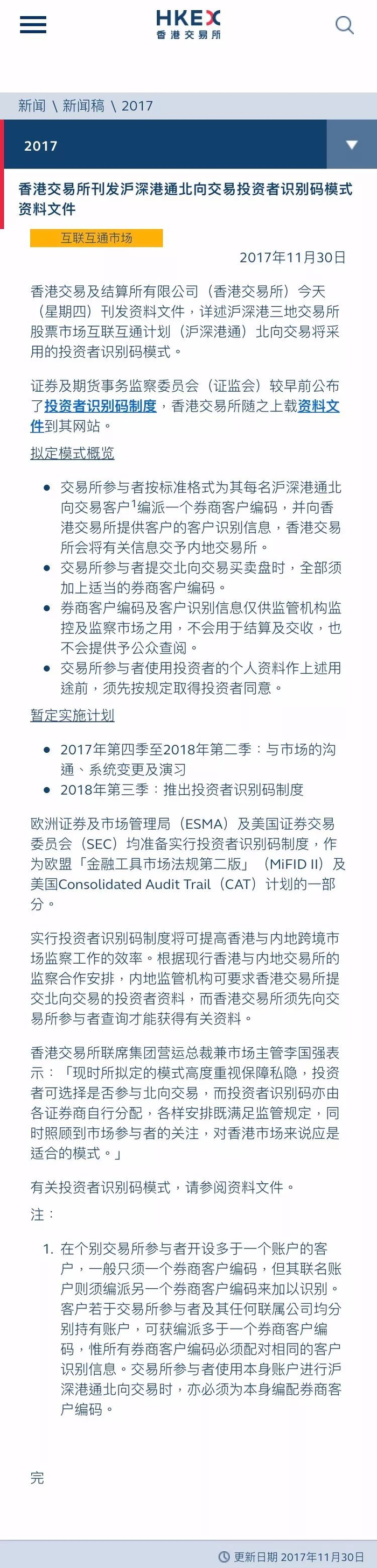 据香港证监会公布,沪股通及深股通交易将引入投资者识别码制度,目前已与内地证监会达成共识。同日,港交所发布建议制度运行细节,拟定于2017年第四季度至2018年第二季度与市场沟通,2018年第三季度推出投资者识别码制度。
