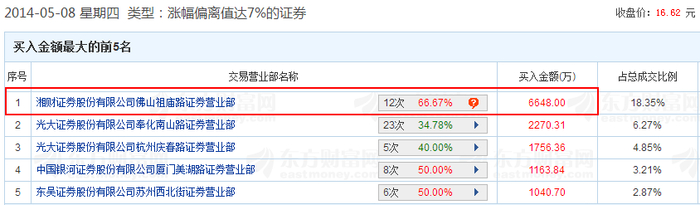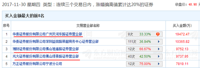 有意思的是,通过结合个股龙虎榜数据,廖国沛所控制账户的栖身营业部也得以现身。其中典型的代表营业部包括4个,分别为:光大证券佛山绿景路营业部、华泰证券广州天河东路营业部、长江证券佛山普澜二路营业部、湘财证券佛山祖庙路营业部。