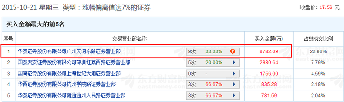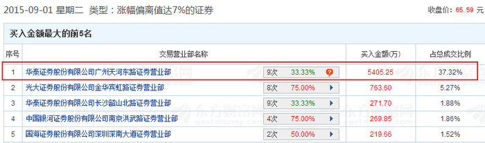 其中,买一正是华泰证券广州天河东路营业部,其买入金额高达近1.95亿元,占当日成交占比超过10%;湘财证券佛山祖庙路营业部、光大证券佛山绿景路营业部则分别位居买三、买四,买入金额也都超过9700万元。