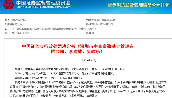 直到2015年10月,“特力A”大涨谜团终于揭晓。证监会披露,吴某乐、深圳市某基金管理有限公司涉嫌合谋操纵“特力A”、“得利斯”股票价格。2016年4月,证监会公布对吴峻乐的处罚书,开出巨额罚单,对其操纵特力A的违法行为没收违法所得1.7亿元,并处以3.4亿元罚款。