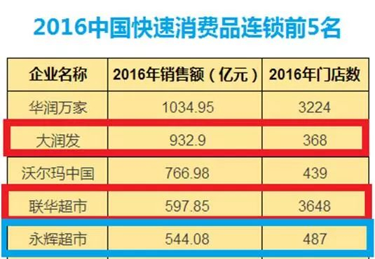 中国连锁经营协会发布的官方数据显示,华润万家、大润发、沃尔玛中国、联华超市和永辉超市位列中国快速消费品连锁企业销售额前五名,销售金额从544亿到1035亿。