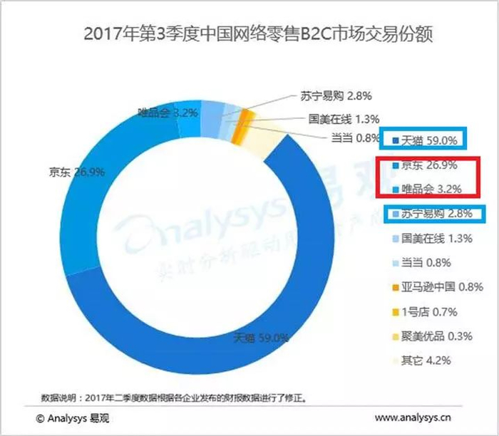 据易观发布的相关研究报告显示,天猫的零售占59%的市场份额,京东占26.9%,唯品会占3.2%;唯品会已当之无愧地成为国内第三大互联网销售巨头。此番收购后,老二、老三将联合对抗老大,最终将是马云与马化腾之间的电商争夺之战。