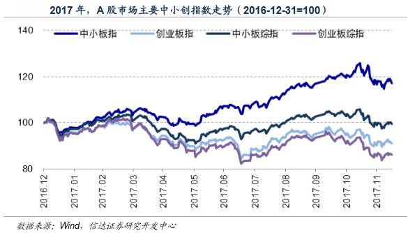 另外值得注意的一点是,虽然指数的走势分化较为明显,但其估值变动并没有市场表现得突出。中小板指数基本维持在30倍至35倍市盈率区间波动,创业板指数则围绕40倍至45倍区间波动。如果对比12月15日与2016年年底的市盈率,则中小板指数市盈率上升4.7%,创业板指数市盈率下降1%,相比之下,指数的涨跌幅之差达到了26%。同样的状况,在中小板综指和创业板综指中,表现也十分明显。