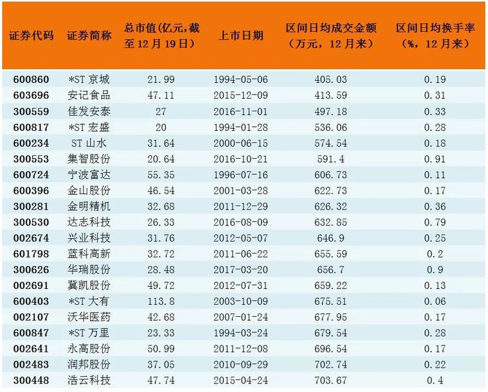 财汇金融大数据终端显示,12月以来,一批小市值股票的日均成交额降至几百万元规模。剔除近期上市的新股,截至12月19日,共计有127只股票日均成交额低于1000万元,其中绝大多数是市值低于100亿元的小盘股。这其中,20多只股票的日均换手率甚至低至0.2%以下,呈现出成交极度低迷的状况。