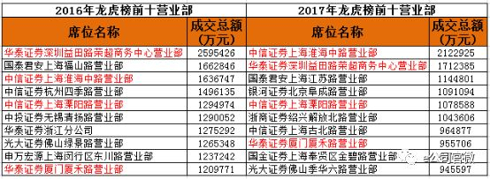 经历两年,龙虎榜中排名前十的营业部席位也发生变化,2017年与2016年相比,仅有4家营业部席位依然保持在年度龙虎榜前十位置。