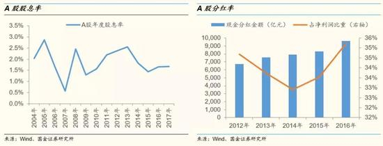 在讨论现金分红问题时,股息率和分红率分别是衡量现金分红收益和力度的重要指标:1)股息率(=每股股利/股价)是反映现金分红收益的指标,量化了现金分红给投资者带来的收益情况;2)分红率(=现金分红总额/归母公司净利润)是反映公司现金分红力度的指标,刻画了上市公司分红的慷慨程度。实际上,股息率和分红率并不是完全独立的两个指标,股息率也可以视作分红率和市盈率的比值,即股息率=分红率/市盈率。目前来看, 2017年A股股息率为1.67%,2016年分红率为35.2%。