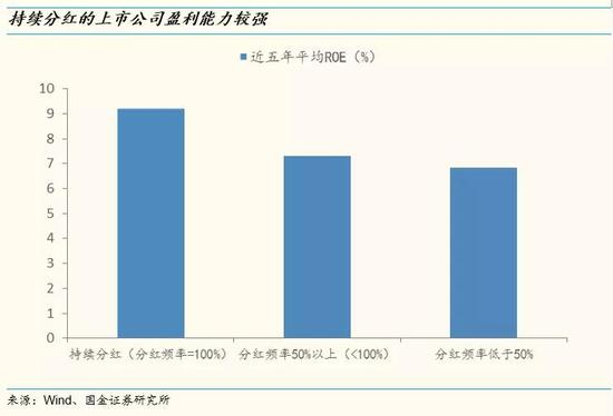 持续分红的上市公司一般都有较强的盈利能力。由于上市公司持续现金分红需要稳定的公司盈利作为支撑,所以持续分红的上市公司一般都有较强的盈利能力。我们统计了所有A股上市以来的分红数据,发现持续分红(即上市以来每年都进行现金分红)的上市公司盈利能力较强,近五年平均ROE为9.2%,高于分红频率较低的上市公司。