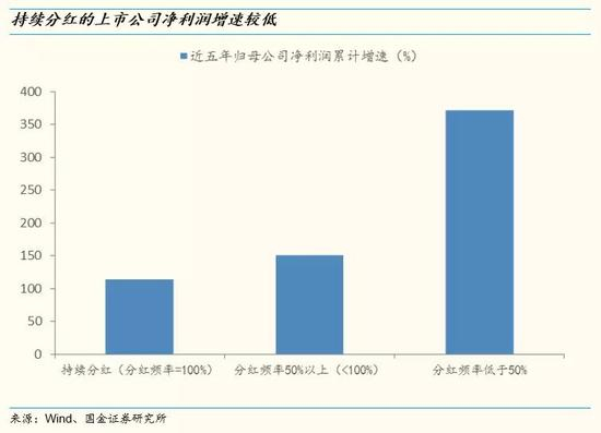 与不分红和少分红的上市公司相比,持续分红的上市公司已过“资本开支大幅扩张,快速成长”的阶段,利润增速维持相对稳定的状态。持续分红的上市公司一般为成长性较差的蓝筹股,对于成长性较好的上市公司来说,公司盈利将主要用于扩大生产投资,较少用于分红。所以数据上来看,持续分红上市公司的近五年归属母公司净利润累计增速为113.6%,大幅低于分红频率较低的上市公司。
