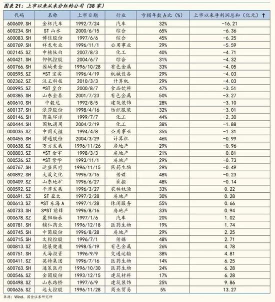 A股市场也存在上市以来从未分红的“铁公鸡”。目前,上市以来从未进行现金分红的公司有38家(我们剔除了上市时间较短,如2015年后上市的公司),其中大部分公司都处于亏损状态,没有能力分红,但是也不乏有盈利但公司处于快速发展的上市公司。