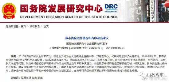 国研中心一篇1月16日的调研报告被翻出,主题是救市资金有序退出建议。有熟悉作者的机构说,作者强调这只是个人观点。报告在去年10月就已经写好,因为国研流程较长,现在才发出来。