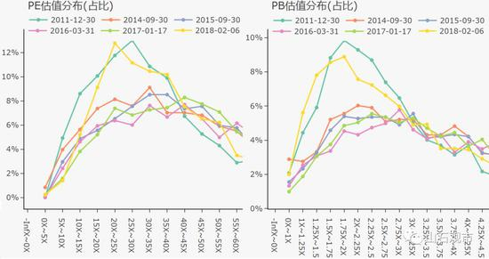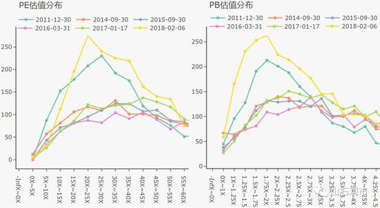 一方面,相比2011年底的水平,依然是15-25这个区间的比例达到跟2011年底相当的水平。但另一方面,35-55PE的这个区间,现在比例比所列其它五个时间点都要多的多。