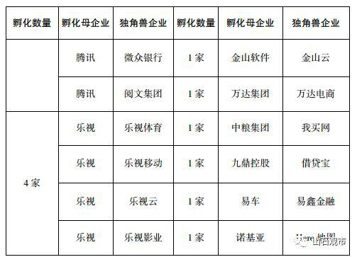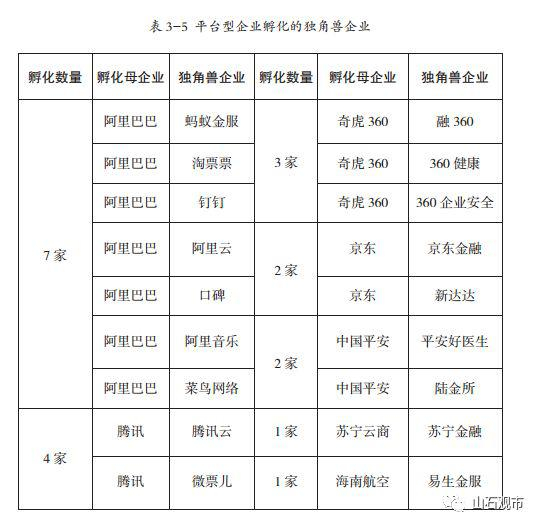 其中,有六家平台型企业孵化独角兽达两家以上,包括阿里巴巴、腾讯、京东、乐视、奇虎 360及中国平安。