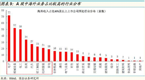 2)从上市公司层面看,依赖海外(美国)业务的个股或受一定冲击。具体到A股市场,A 股上市公司中海外(美国)收入占比较高的行业主要集中分布在“电子、机械设备、化工、汽车、家具玩具”等。
