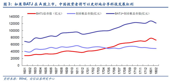安信证券研报表示,我国已经诞生了一批伟大的高科技企业,但A 股投资者往往无缘分享这些高科技企业飞速发展带来的资本红利。从市值来看,A 股中的创业板总市值近两年涨幅很小,而BATJ 的总市值则增长了接近两倍。如果这样一批优质的新经济高科技公司在A 股上市,A 股投资者将有机会从这些科技龙头身上获取更好的回报。