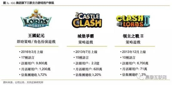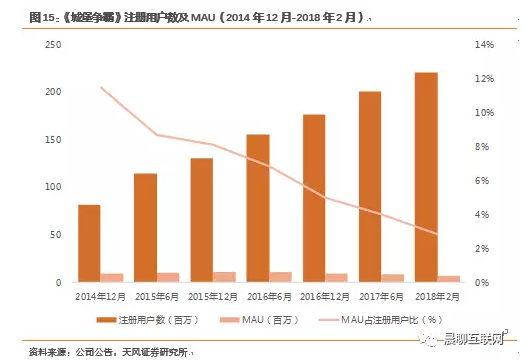 《城堡争霸》:该游戏的月流水稳中有降,2017年平均月流水USD1,100万;截止2018年2月,该游戏注册用户达到2.2亿,MAU620万,占注册用户的2.8%.目前该游戏贡献公司总收入的20.5%;