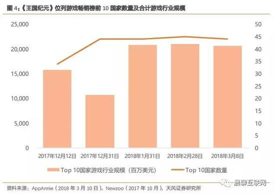 《王国纪元》流水再创新高,中国安卓市场贡献稳步提升,公司在印尼、巴西等新兴国家也会加大投入。公司总体注册用户达到4.8亿,平台MAU达1,900万,较去年同期分别增长26.3%和11.8%。用户层面,截止2018年2月,《王国纪元》注册用户9,800万,MAU为1,200万,相较17年6月分别增长104.2%和79.1%。管理层计划2018年日均获取新增用户30万,其中中国用户占比20%,为18年的平稳增长奠定坚实的用户基础。收入层面,《王国纪元》受益于新版本更新和欧美圣诞促销,17年12月流水突破5,000万美元大关,2018年2月在中国安卓市场推动下创下历史新高5,600万美元(28天),进一步推高游戏的峰值流水。《王国纪元》在2017年12月13日进行“契约魔物”新版本更新,助力该游戏在全球市场表现再上一个台阶,得到大市场认可。全球区域扩张,分拆来看2018年初,《王国纪元》在44-45个国家及地区位列游戏榜前10名,涵盖12.6-13.2亿人口与7.9-8.2亿网民,覆盖国家及地区的游戏行业规模合计达到206.7-210.3亿美元,相较2017年12月12日提升31%-33.3%,渗透率提高4.3-4.6个百分点至18.2-18.5%。特别是,美国安卓Google Play畅销榜显示,《王国纪元》的游戏畅销榜排名逐渐走高,从16名左右提升到稳定前10名。