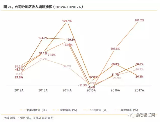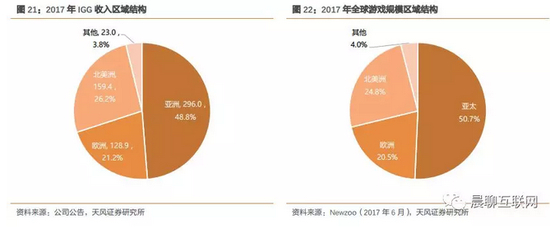 2017年,IGG在亚洲收入达3.0亿美元,同比增长181.7%,占总收入的48.8%,相较2016年增长16.2百分点;北美地区收入为1.6亿美元,同比增长60.6%,占总收入的26.2%,同比减少4.6百分点;来自欧洲的收入为1.3亿美元,同比增长26.3%,占总收入的21.2%,同比减少10.5百分点。2017年与2016年各占三分之一的平稳格局不同,与全球游戏市场格局基本一致。
