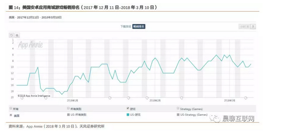 具体来看该游戏在中美两国市场的表现,《王国纪元》在中国安卓市场的累计下载量稳定爬坡,根据ASO114的数据,《王国纪元》在2018年3月10日累计下载量达到48.6万,平均一个月增长18万新用户。苹果应用商城畅销榜稳定在游戏榜15-25位,中枢在20位左右,在腾讯网易高质量新游戏迭出的2018第一季度,该表现从侧面印证《王国纪元》新版本的高质量。美国安卓Google Play畅销榜显示,《王国纪元》的游戏畅销榜排名逐渐走高,从16名左右提升到稳定前十名,两大游戏市场中不断走俏,增强我们对《王国纪元》强生命周期的期待。