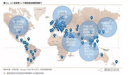 IGG截止2017年,集团游戏用户遍布全球200多个国家及地区,在全球10多个国家及地区拥有本地的研发团队和运营团队,在全球拥有15个研发项目组,与全球100多家平台商建立长期合作关系。IGG全球化布局围绕全球游戏市场规模前100国家及地区展开,做到基本覆盖这些重要市场。