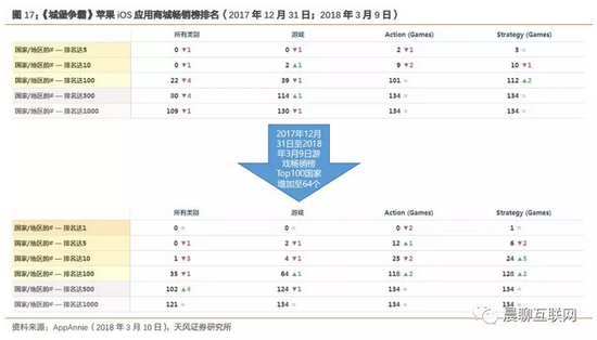 高质量更新内容推动游戏在全球表现再上一个台阶,得到更多优质市场认可。在版本更新之前,王国纪元在全球34个地区位列游戏畅销榜前10,这些国家及地区合计拥有12.8亿人口,网民数量6.9亿,游戏行业规模合计达到157.8亿美元,占全球游戏行业规模前100国家总值的13.9%,在版本更新之后,2018年1月至2018年3月8日,《王国纪元》的表现提升一个台阶且较为稳定。在44个国家及地区位列游戏榜前十名,涵盖12.8亿人口与7.9亿网民。覆盖国家及地区的游戏行业规模合计达到206.7亿美元,相较2017年12月12日提升31%,渗透率提高4.3个百分点至18.2%。