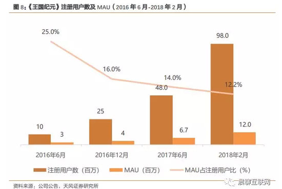 《王国纪元》:月流水在2017年12月突破USD5,000万,一年时间流水提升近USD2,000万,年度流水同比提升252%; 截止2018年2月,MAU达到1,200万,占注册用户9,800万的12.2%。目前该游戏贡献公司总收入的72.1%;