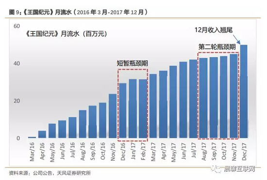 截止2018年2月,《王国纪元》的累计注册用户数达到9,800万,MAU为1,200万,占注册用户数的12.2%。8个月时间里注册用户增长5,000万,MAU增长530万,尽管MAU占注册用户比在逐渐减少,但依然远高于公司平均水平4.0%(2017年6月为4.2%,公司整体活跃率下降0.2百分点)。管理层计划2018年日均获取新增用户30万,其中中国用户占比20%,为18年的平稳增长奠定坚实的用户基础。