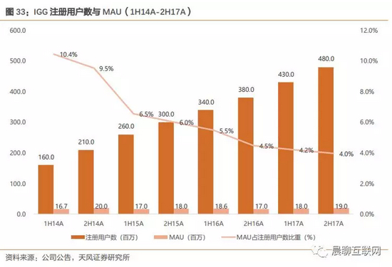 总体活跃用户:截止2017年12月31日,IGG公司所有产品总MAU达到1,900万,同比增加11.8%,占注册用户数的比例为4.0%,同比下滑0.2百分点;