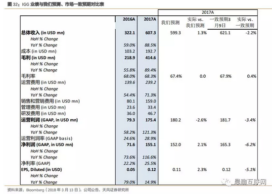 【收入】FY17收入达到USD6.07亿,同比增长88.5%,主要受益于主要受益于《王国纪元》的收入持续增长导致(17年末月流水达到5,000万美元量级),高于我们预期1.3%,低于市场预期2.2%;亚洲区域收入同比增长181.7%至2.96亿美元,占IGG公司营收48.8%。公司在App Annie的排名已经升至Top21(vs. Top27 in FY16 vs. Top34 in FY15)